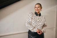 Des pois, des pois, des pois ! On adore ce design classique et mignon. Le thème Modern Romance met en avant les classiques que nous aimons tous, de la dentelle délicate au célèbre pois. Ce motif noir/cassé est imprimé sur un joli tissu jacquard blanc cassé scintillant, ajoutant une touche de luxe. Cette robe midi incontournable est rehaussée d'une dentelle florale noire près de l'encolure, tandis que la dentelle noire de la blouse se trouve sur son col.